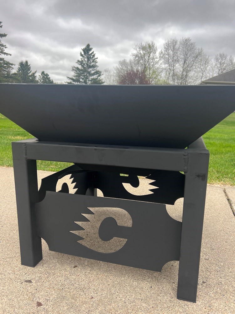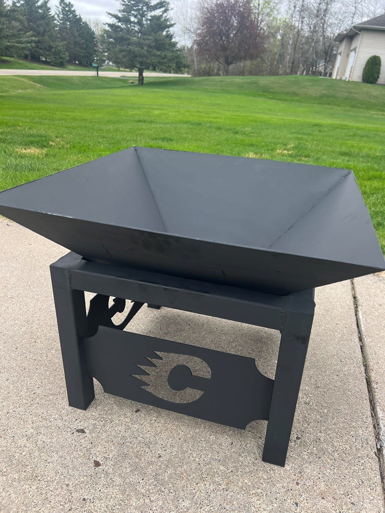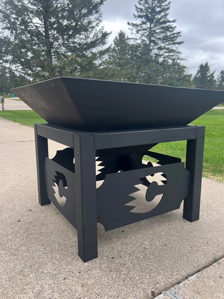 This student made, beautifully crafted bonfire pit is 28"x28". Top and bottom come apart for easier transport or moving. It is heavy, well made, and great for bonfires with holes in the bottom for air circulation.