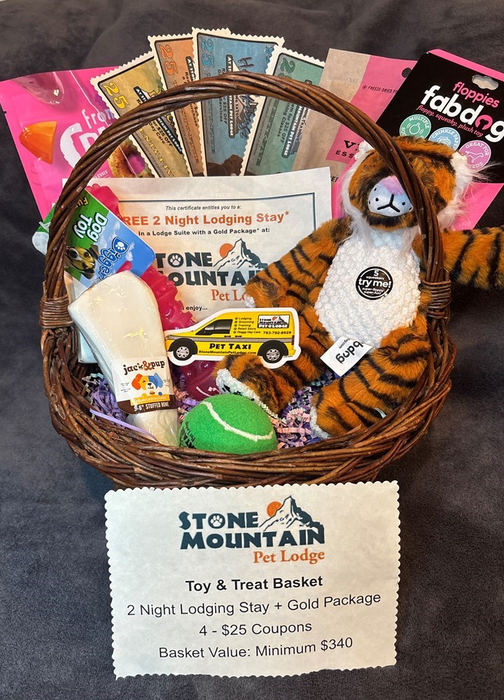 Pamper your Pup at Stone Mountain Pet Lodge in Blaine. 4 $25 Coupons- Retail Purchase/Doggy Daycare/Grooming Services/Training Classes 2 Nights Lodging Stay Crunchy Dog Treats Vital Essential Dog Treats Diggers Dog Toy Jack & Pup Bone Fab Dog Floppie stuffed tiger toy Tennis Ball Value $340.00 Stone Mountain Pet Lodge 9935 Radisson Road Blaine MN 55449