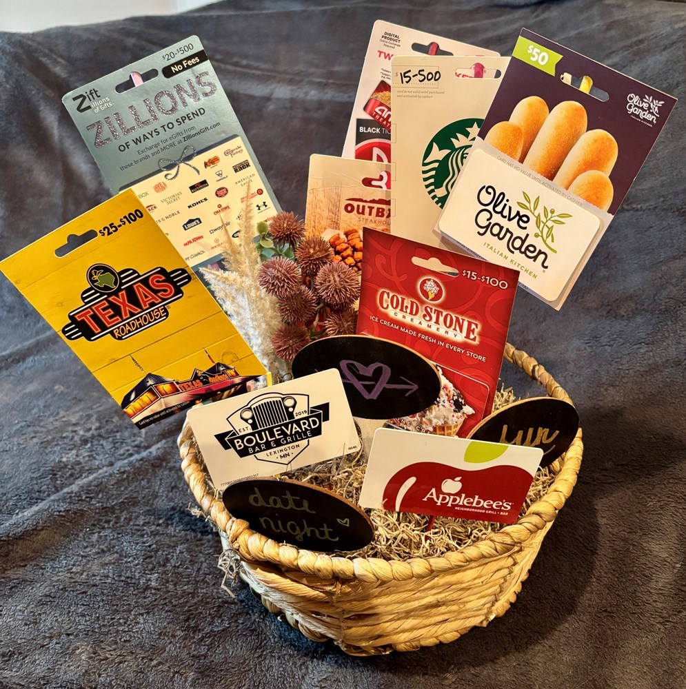 Rice Lake Elementary Basket -Date Night Value $290 $50 Texas Road House Gift Card $50 Outback Steak House Gift Card $50 Olive Garden Gift Card $30 Applebees Gift Card $20 Boulevard Gift Card $20 Zillion Ways to Spend Gift Card $20 Starbucks Gift Card $20 AMC Gift Card plus 2 Movie tickets