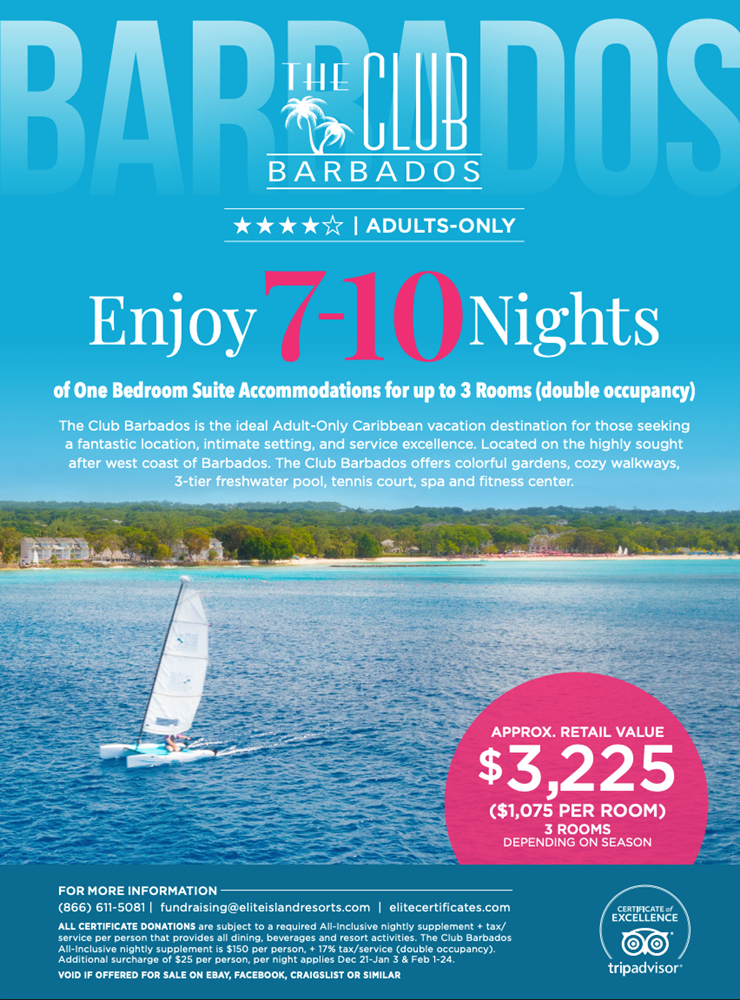 THE CLUB BARBADOS • EXCLUSIVELY ADULTS $150 per person/per night (based on double occupancy + tax/service The Club Barbados, located on the prestigious platinum west coast of the island offers guests an adults only experience. There is plenty to enjoy with spacious accommodations, three freshwater swimming pools, water sports, two dining options, tennis, fitness center, spa, piano bar & lounges. The Club Barbados exudes intimacy with its romantic oceanfront setting, tropical gardens, cozy walkways, and friendly social atmosphere. This Certificate provides One-Bedroom Suite accommodations for up to 3 rooms (double occupancy) for up to 10 nights per room. (valued up to $1,075 per room depending on dates of travel) at The Club Barbados. All reservations are subject to a required supplement of $150 per person/per night which provides all dining, all beverages (including alcohol), resort facilities & activities. Government tax/service is additional. Guests choosing to upgrade to a higher room category may do so for as little as $56 per room, per night based on availability at time of booking. Air transportation is not included. Resort black-out dates do not apply however, minimum 7 night stay and additional peak season surcharge of $25 per person, per night applies Dec. 21-Jan. 3 & Feb. 1-24. Reservations are subject to availability, some restrictions apply. Expiration date is a “Book By” date not a “Travel By” date. Nightly rates are subject to change and the resort's normal cancellation policies.