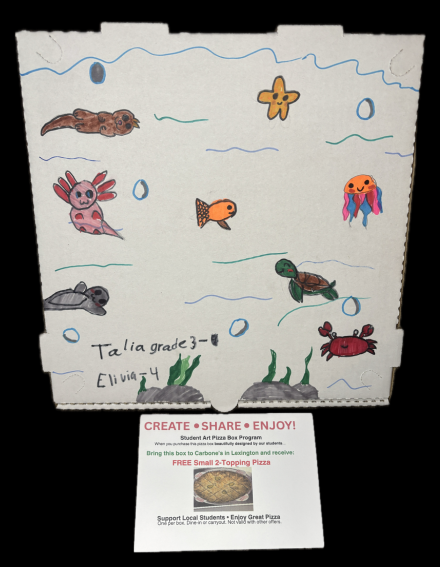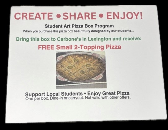 Carbone's of Lexington 10" 2 Topping Pizza. Carbone’s in Lexington has generously donation free pizzas. With help from our amazing Kids Club staff and students, each box has been carefully designed just for YOU! Buy your own delicious pizza in a designer box NOW! Information on how to redeem your pizza will come with each pizza box. A huge thank you to Carbone’s and all of the student artists. Value $20